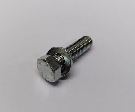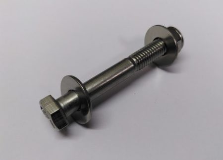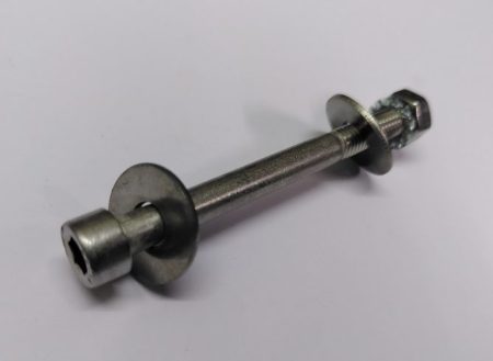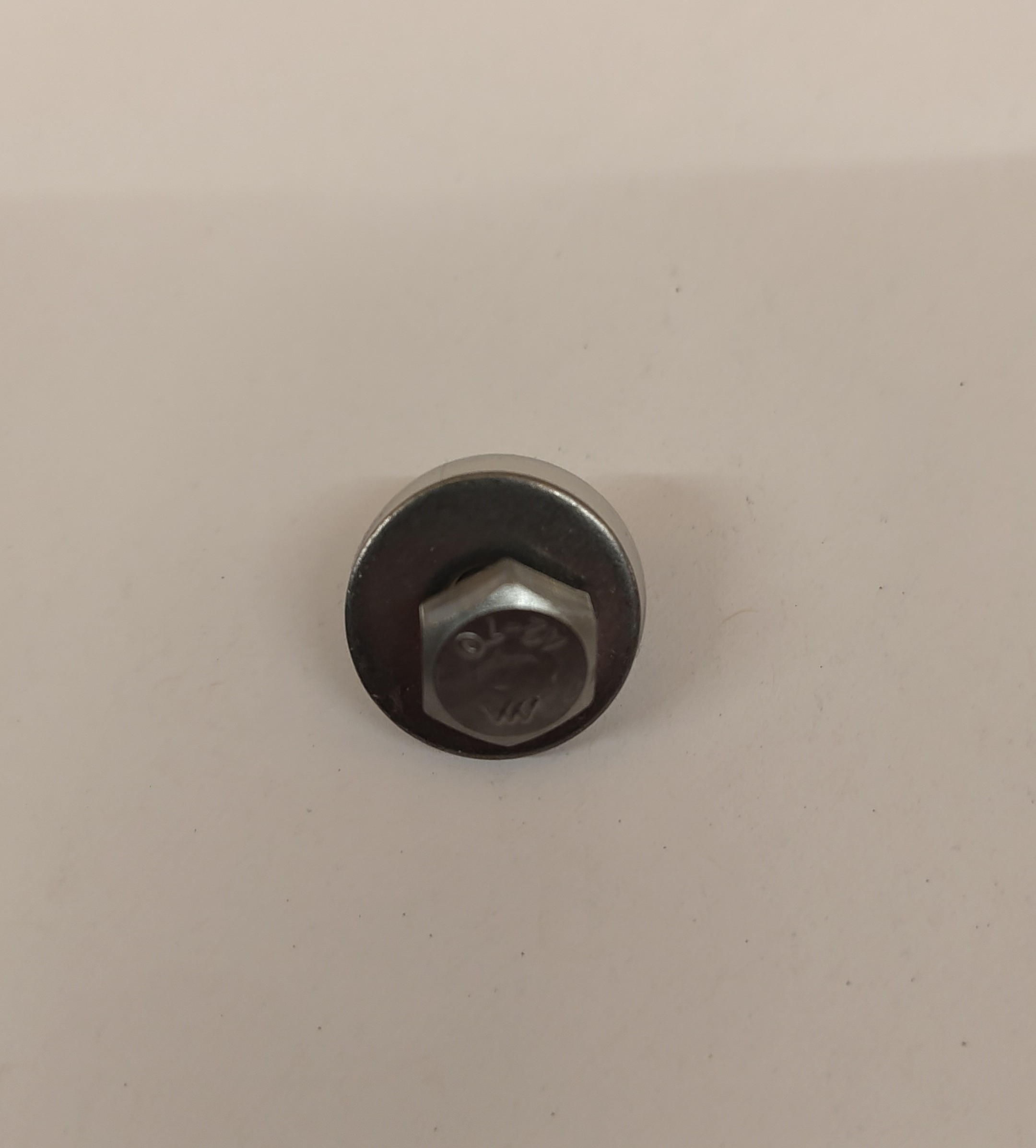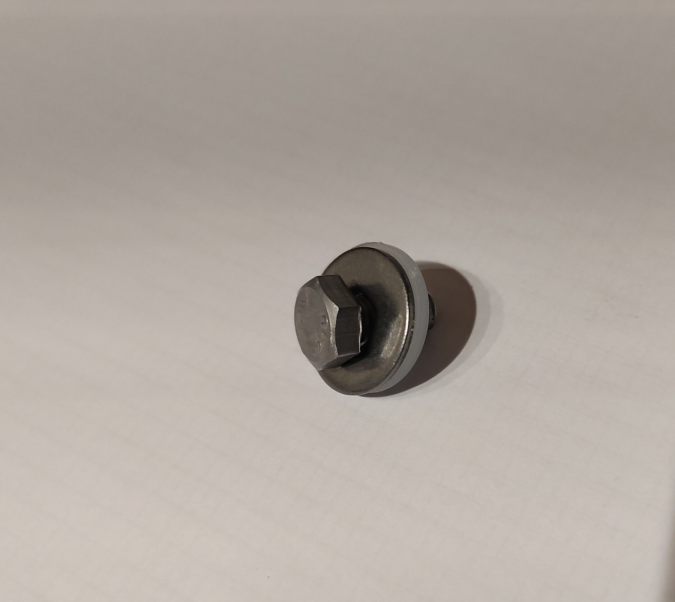 Sechskantschraube mit grosser Unterlagscheibe und Kunststoffscheibe zur Befestigung und Schutz der beiden Kettenschutzbleche bei 2. Serie Belmondo. INOX/Kunststoff nicht rostend.